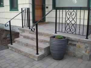 Vertical picket guardrail with double top rail, custom forged scroll design, and twisted pickets.