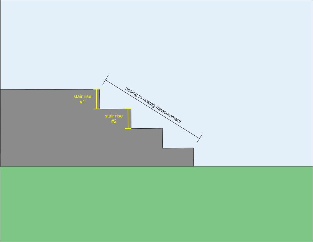 You will need to provide the nosing to nosing measurement of your stairs and the rise of 2 or more steps. Please see illustration in graphic below on how to find these measurements.